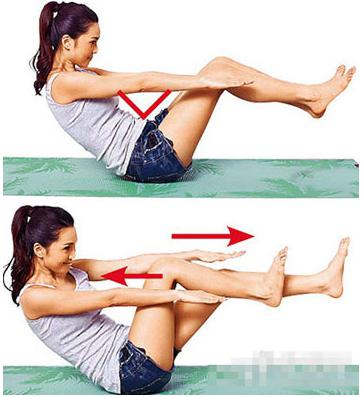 動(dòng)作3 屈膝坐,腳掌不貼地,以臀部撐住全身重量,上半身到膝關(guān)節(jié)呈V字型,雙手平伸。 動(dòng)作4 身體不動(dòng),左手往前伸且右膝往后平移,回動(dòng)作3再換邊。動(dòng)作3~4重復(fù)20下為1回,做4回。 |